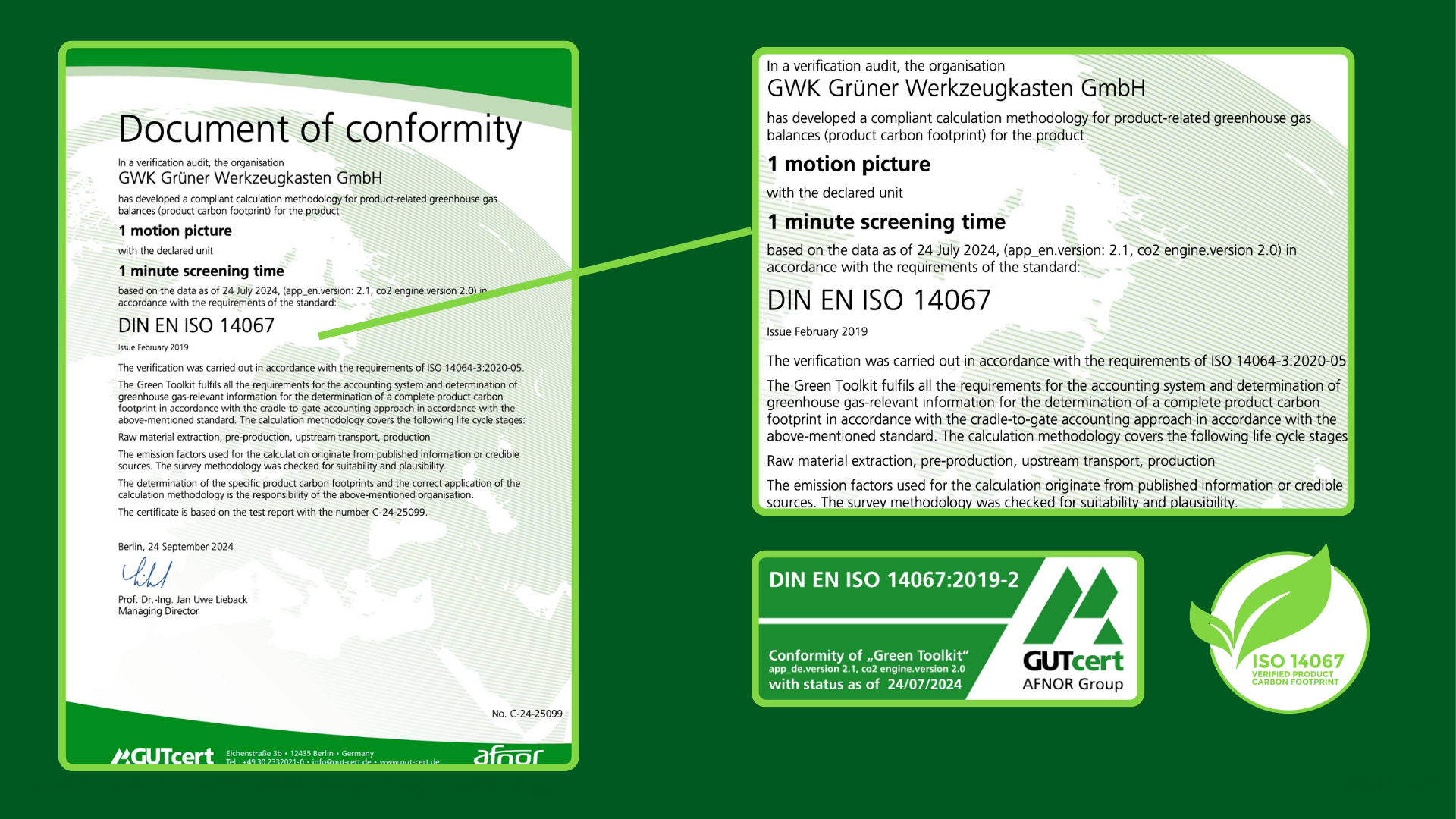 Konformitätsbescheinigung zur Berechnungsmethodik des Green Toolkit gemäß DIN EN ISO 14067 Klicken zum Vergrößern