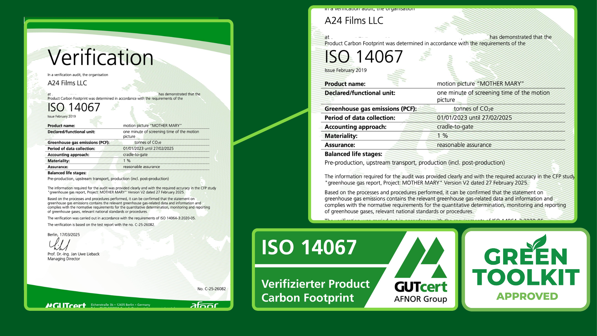 ISO 14067 Verifizierungszertifikat für die Filmproduktion „Mother Mary“ mit Bestätigung der Product Carbon Footprint Berechnung gemäß DIN EN ISO 14067 Klicken zum Vergrößern